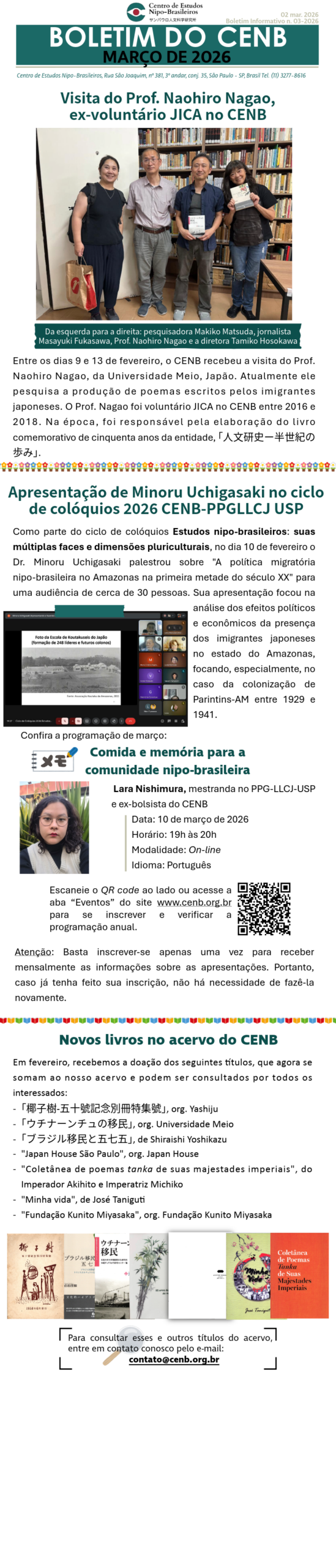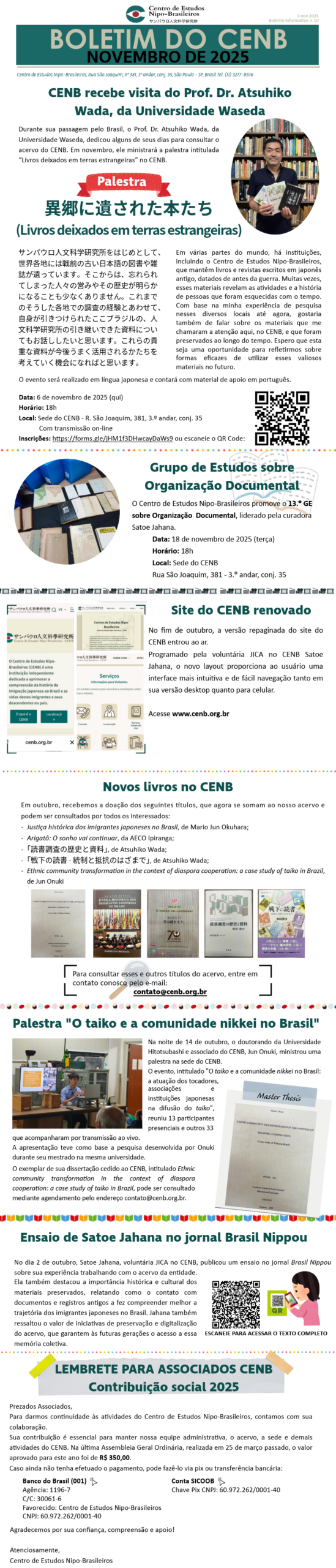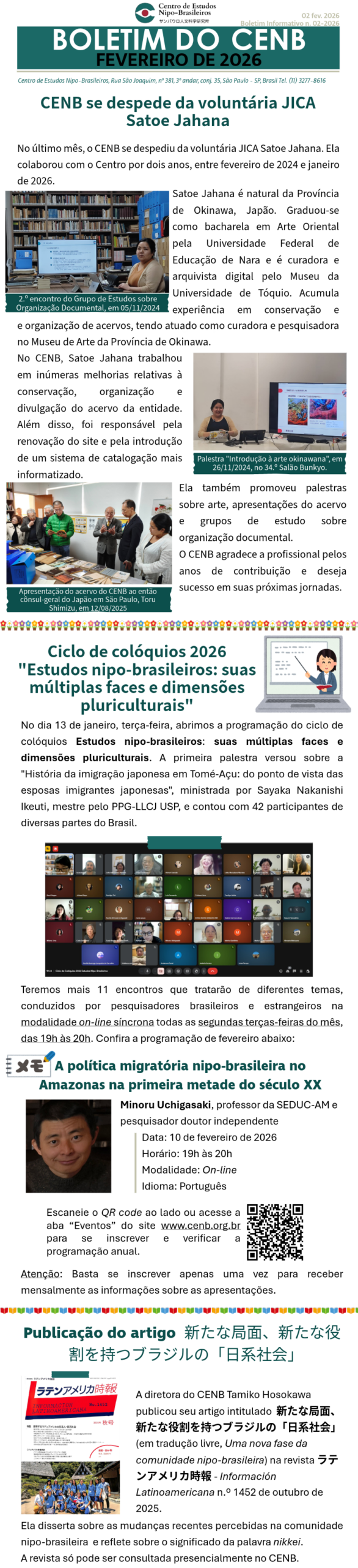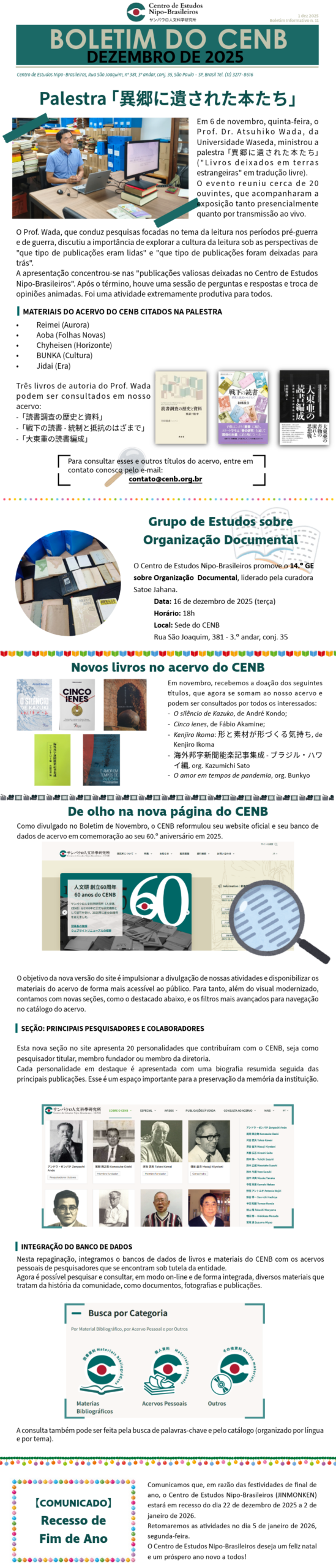 記事一覧 BOLETIM DO CENB | MARÇO 2026 2026-03-02 BOLETIM DO CENB | FEVEREIRO 2026 2026-02-02 BOLETIM DO CENB | JANEIRO 2026 2026-01-09 Estudos Nipo-Brasileiros: suas múltiplas faces e dimensões pluriculturais 2026-01-07 BOLETIM DO CENB | DEZEMBRO 2025 2025-12-01 陶芸家・生駒憲二郎氏が写真集寄贈のため来所=Visita do ceramista Kenjiro Ikoma para doação de fotolivro 2025-11-21 BOLETIM DO CENB | NOVEMBRO 2025 2025-11-03 人文研60周年を迎えて─保存と近代化 2025-10-17 Preservar, modernizar (O Jinmonken aos 60 anos) 2025-10-16 人文研ウェブサイトとデータベースをリニューアル― 日系社会の歴史資料をより身近に ― 2025-10-14 1 2 3 4 … 27次へ