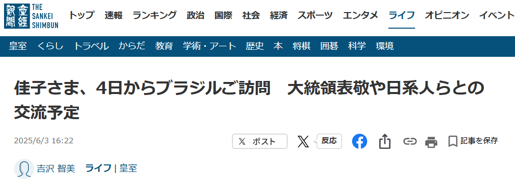 2025年6月3日付 産経新聞にて、弊研究所理事の細川が、佳子さまのブラジルご訪問に関連する記事で取材されました。