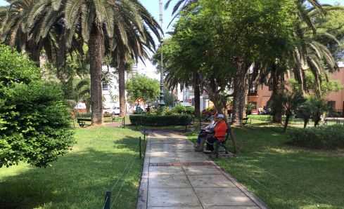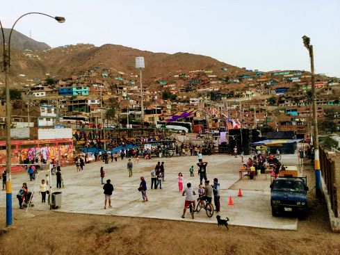 Comas地区の広場、pueblo jovenが山肌に広がる