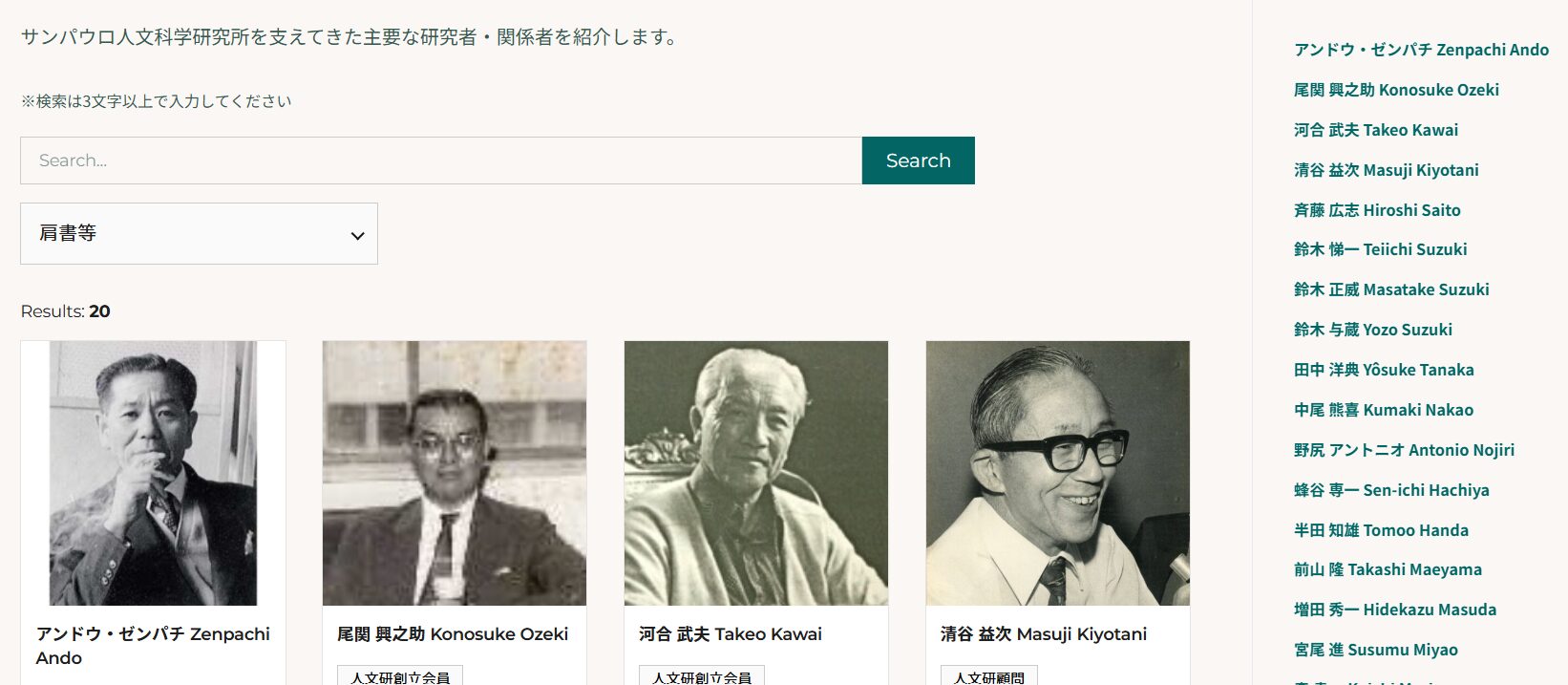 人文研の発展を支えてきた研究者や関係者を紹介します。キーワードや肩書での検索・絞り込みが可能です。